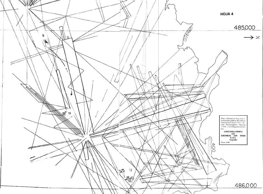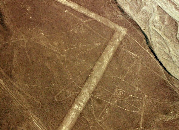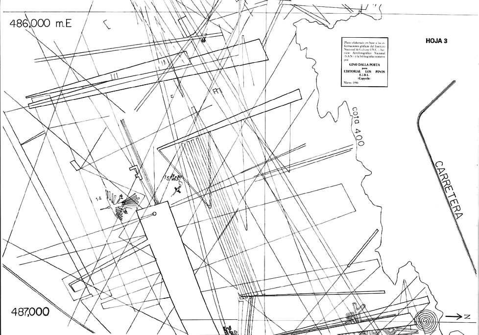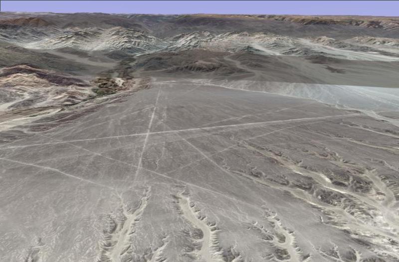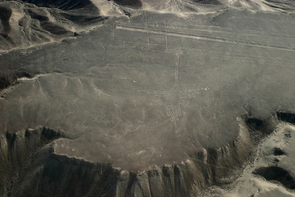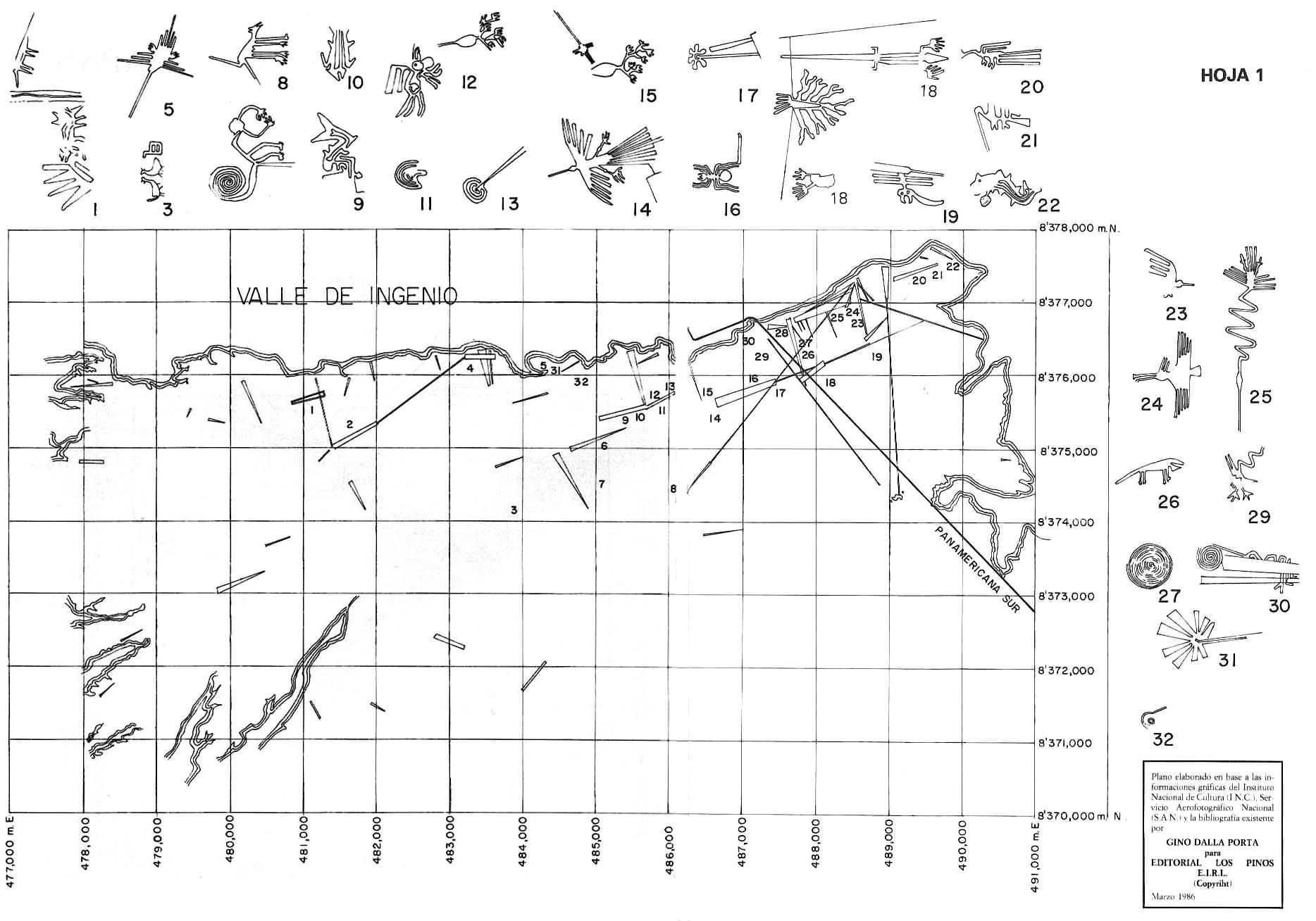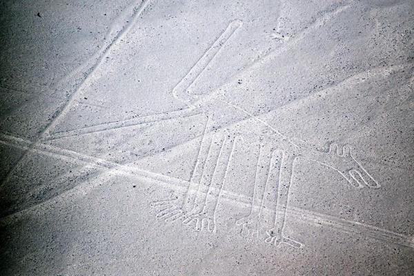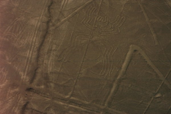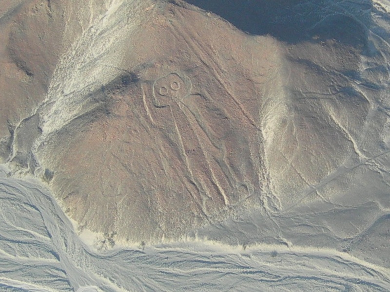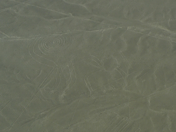 Поверхность перуанской пустыни Наска площадью примерно в 500 квадратных километров покрыта бесчисленными наземными фигурами, гигантскими по нашим представлениям. На плато насчитывают 13 тысяч линий, 100 различных спиралей, свыше 700 прямоугольных и трапециевидных площадок. В первую очередь внимание привлекают громадные изображения животных: обезьяна, ящерица, собака, рыбы и множество птиц. Есть изображение цветка, подобие дерева. Но таких информативных рисунков чуть более трех десятков, то есть они составляют примерно 0,2% от общего числа фигур. Все остальное - это геометрические фигуры: линии длиной до 8 км, вытянутые прямоугольники (самый большой примерно 80х780 м), стреловидные треугольные и трапецеидальные площадки. Среди них разбросана так называемая "декорация" в виде бесчисленных кнутовидных фигур (треугольник с линией, выходящей из вершины под углом), прямоугольных и синусоидальных зигзагов, спиралей. Кроме того, на плато расположено более десятка так называемых "центров" - точек, из которых в разные стороны отходят линии.